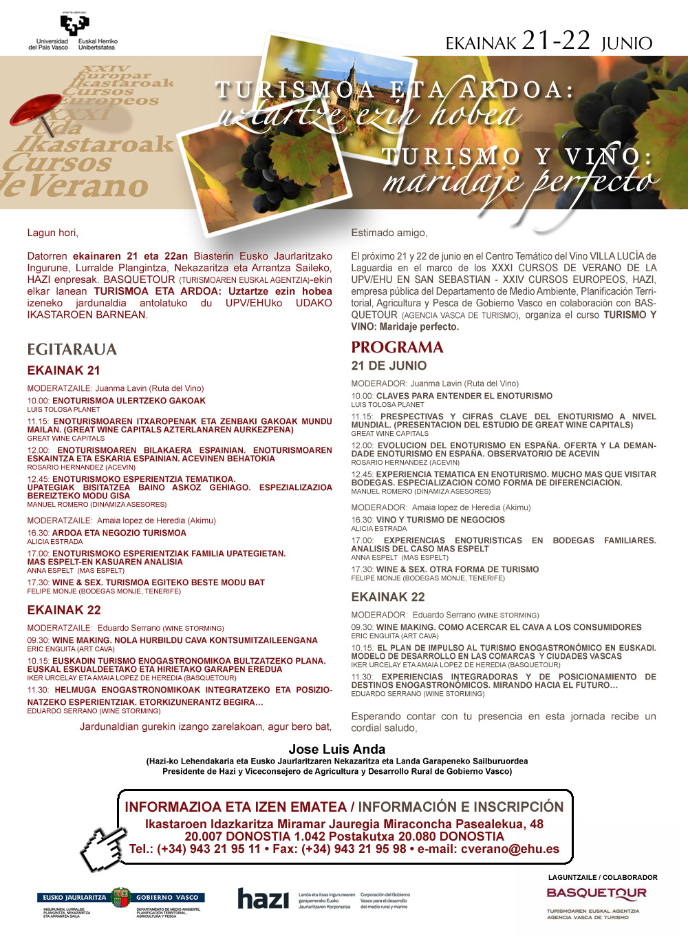 La Universidad del País Vasco nos acerca a Laguardia uno de sus cursos de verano, «Turismo y Vino: maridaje perfecto». ¿Cuándo? el 21 y 22 de junio de 2012 en el Centro Temático del Vino de Villa Lucía (Laguardia) .