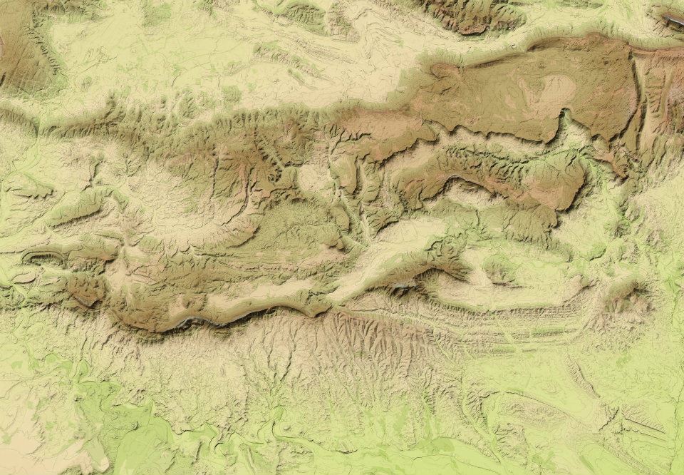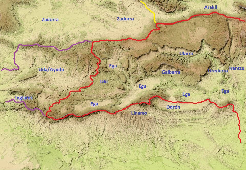 Las cuencas fluviales del Ega, Ayuda e Inglares se nutren de los manantiales que brotan en la comarca natural que forman el Condado de Treviño, Montaña Alavesa y Tierra Estella (que se visualiza nítidamente en esta versión preliminar del mapa en la imagen inferior), surcada por el norte por las sierras de Urbasa-Entzia y, por el sur, por la cadena que forman Montejurra-Codés-Cantabria-Toloño, estribaciones que unen las cordilleras cantábrica y pirenaica (como se observa en el primer mapa de arriba).
