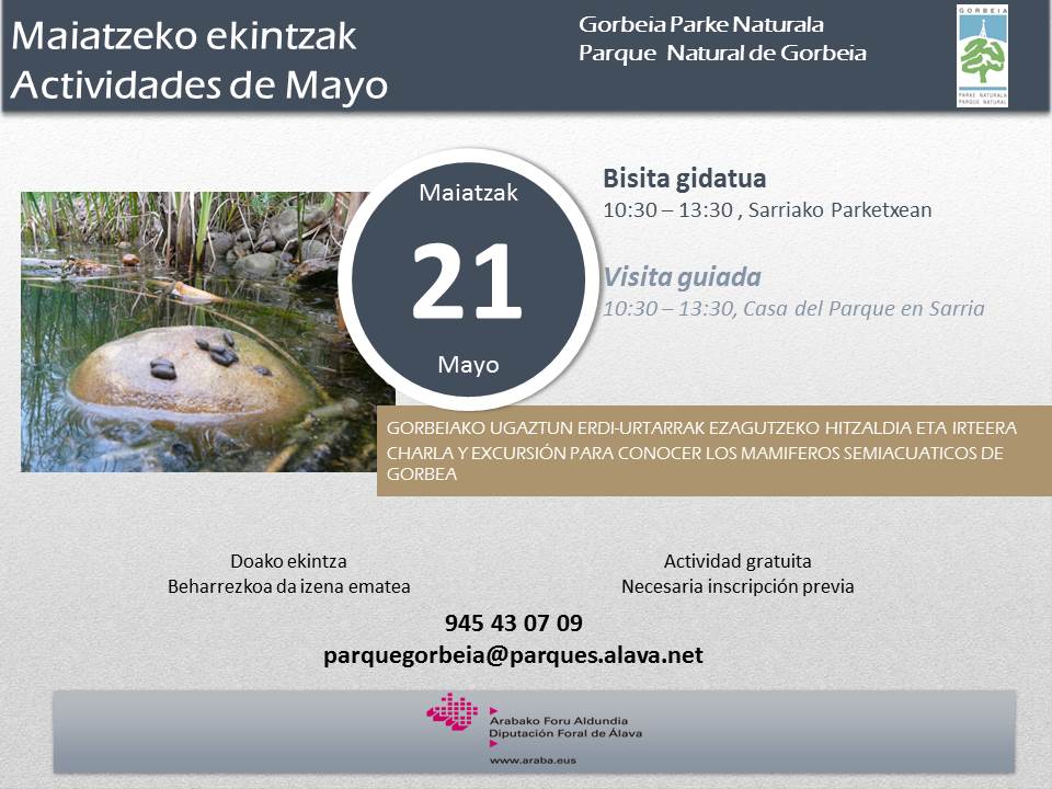 - Mamíferos semiacuáticos del río Baias, charla y salida interpretativa (21 de mayo de 2016, Parque Natural de Gorbeia).